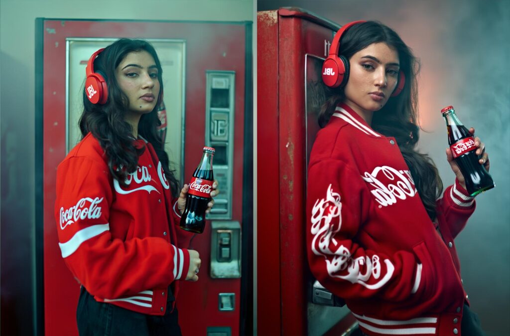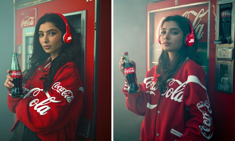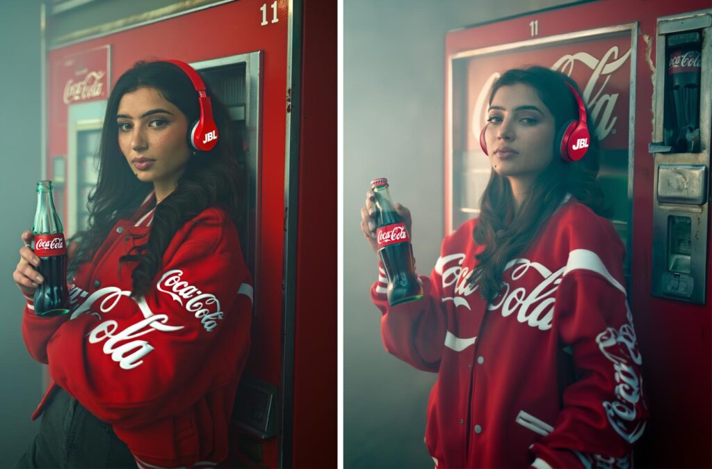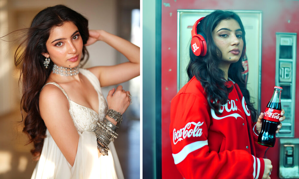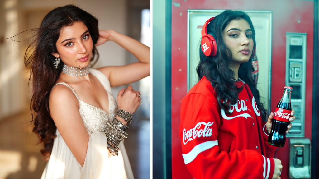 This is Actress Sara Arjun, with a poised and elegant presence. She is captured in soft natural light that highlights her expressive eyes, smooth skin tones, and calm confidence. The flowing outfit and traditional jewelry add a timeless, graceful charm, blending classic beauty,… “Let’s see how to transform this stunning Coca-Cola look using cinematic styling.”